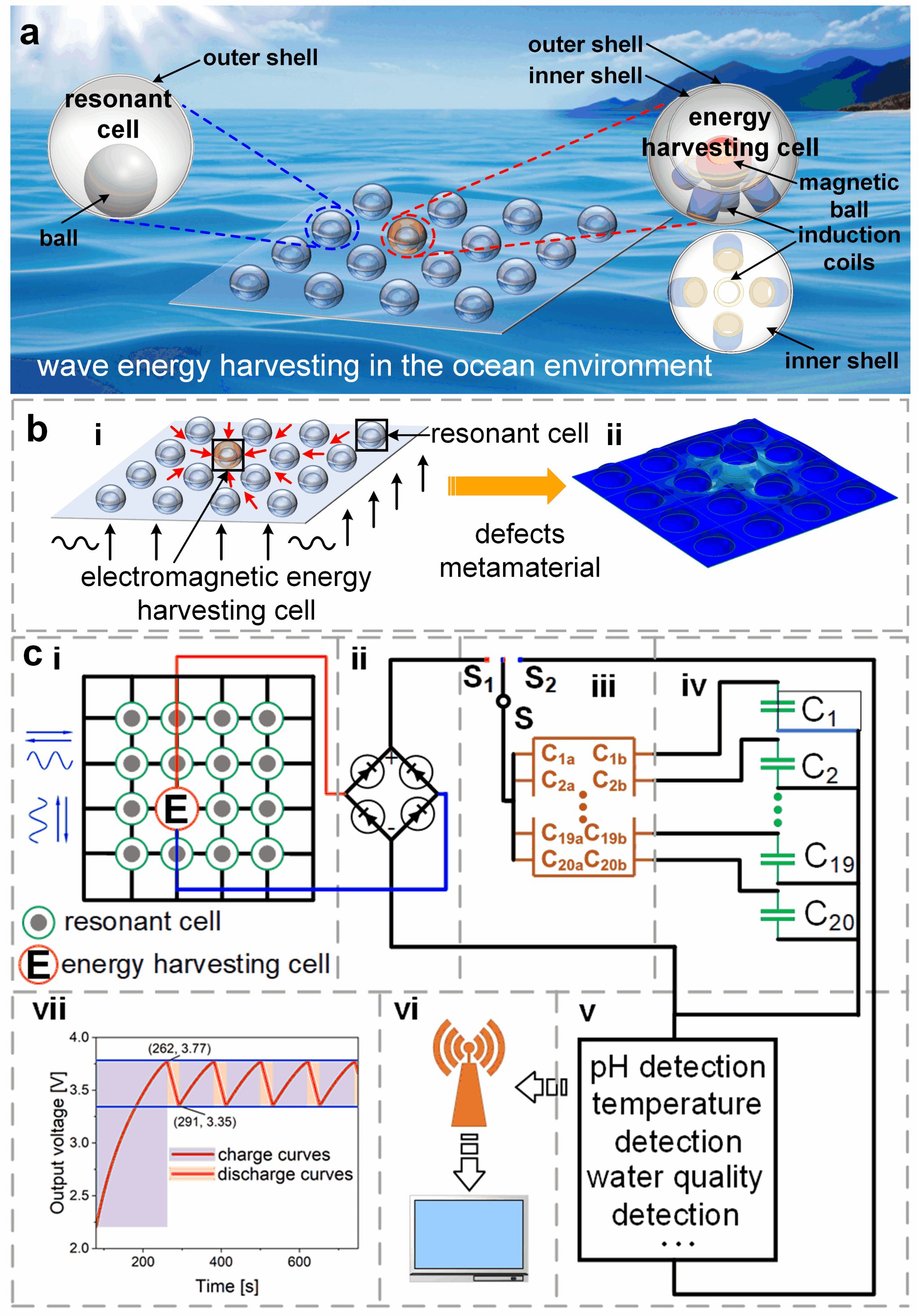 构建海洋物联网需要一个必不可少的海洋环境监测系统。然而,现有的广泛分布的海洋监测传感器使得通过电缆提供电力和传输监测信息变得不切实际。因此,海洋环境监测系统特别需要持续的电源和无线传输能力来监测信息。团队通过材料、结构和信号传输的集成动态匹配优化,设计了一种高强度、环境多兼容、可漂浮的超材料能量收集装置。自供电监测系统突破了电缆和电池在超低频波环境(1至2 Hz)中的局限性,能够实时监测各种海洋参数,并将数据无线传输到云端进行后处理。与海洋环境中的太阳能和风能相比,基于超材料缺陷态特性的能量收集装置实现了高能量密度(81 W/m3)。首次实现了监控系统在各种天气条件下(24小时)的稳定供电。